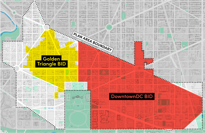 This map shows the geographic area of the Action Plan. The plan boundary within the black outline was delineated as “downtown” in Mayor Bowser’s Comeback Plan. The area covered by the DowntownDC BID is in red. The area covered by the Golden Triangle BID is in yellow. There are additional maps that we completed during Action Plan development which further define the study area.